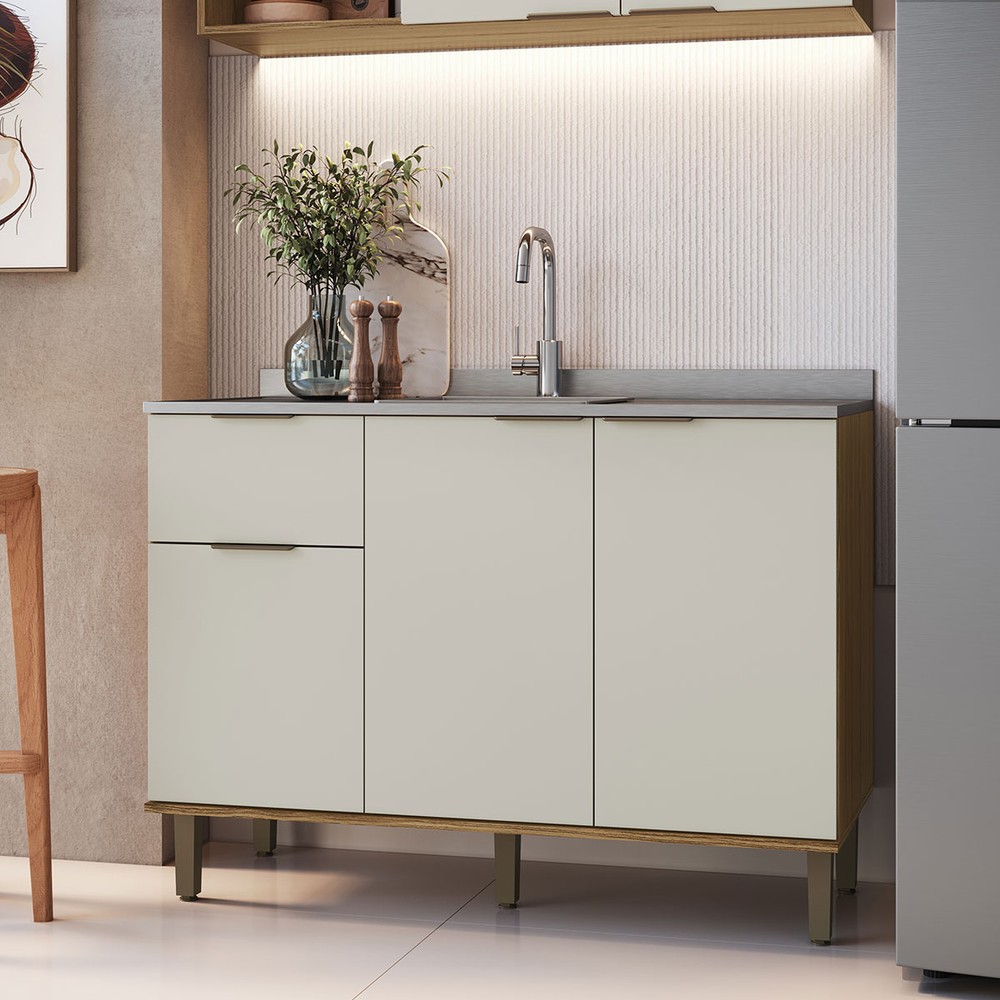 Balcão de Cozinha para Pia 120 Cm Florença 3 Portas 1 Gaveta Naturalle/Sabbia - Decibal