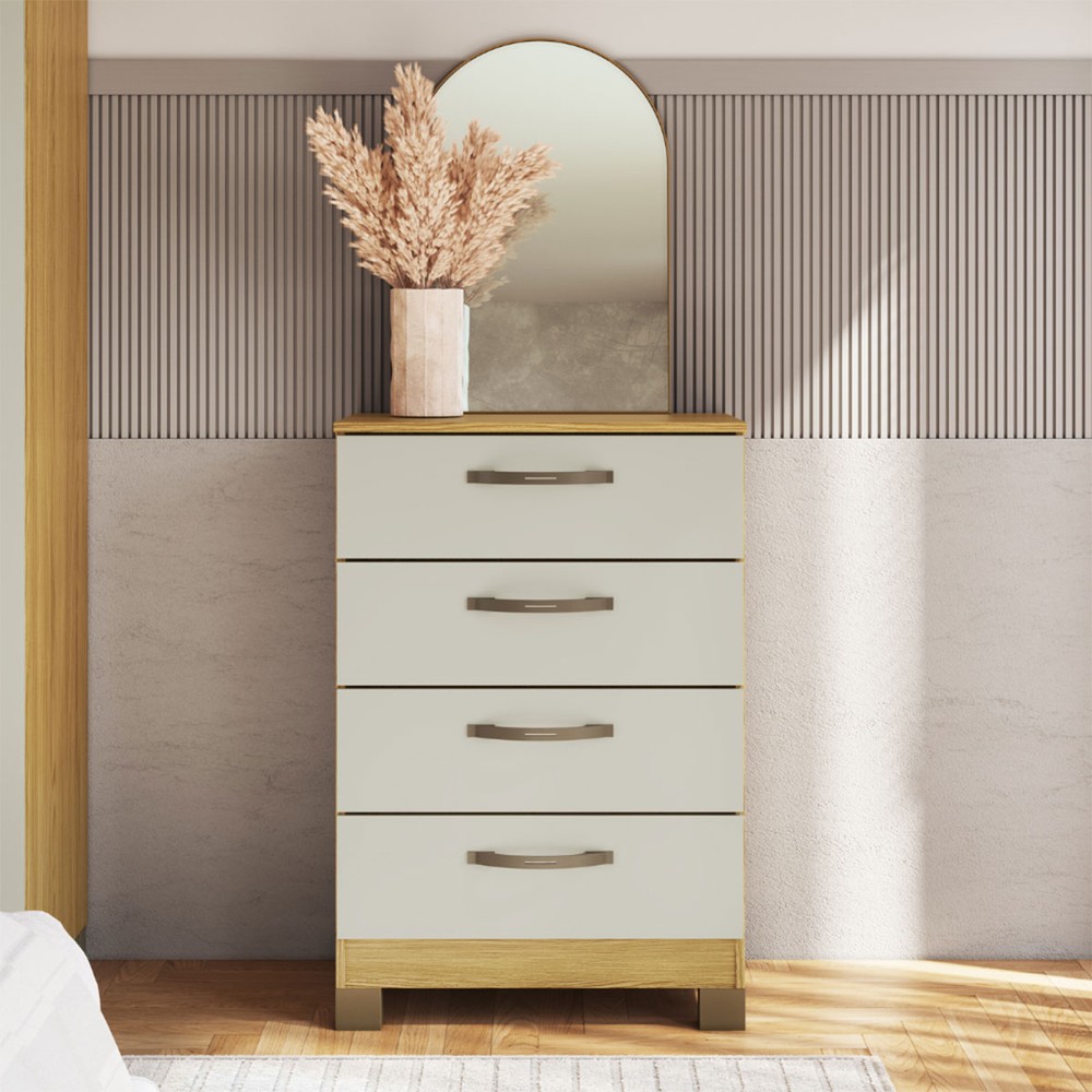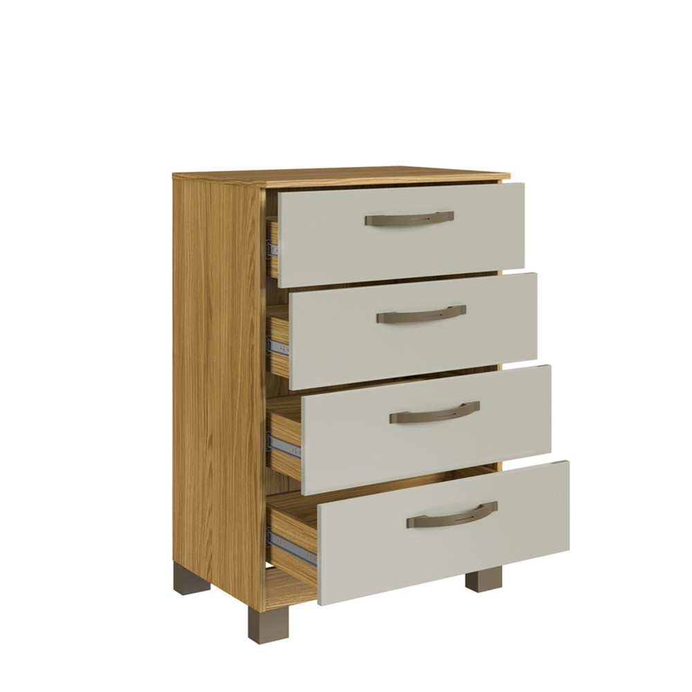 O(a) Cômoda Basic 4 Gavetas Ipê/Cristalo - Decibal é produzido em MDP na escala de brilho Fosco, e possui um grau de dificuldade de montagem: Médio.